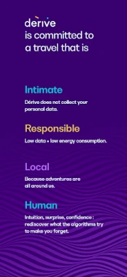 - Responsible: Dérive is a lightweight application. It doesn't need to constantly optimize your journey time and display a map full of information to work. As a result, there is less CO2 emitted and less impact on your battery!