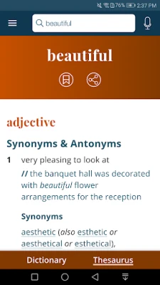 Offline access: You’ll have complete access to definitions and synonyms whether or not you’re connected. You will need a connection to view illustrations, hear audio pronunciations, and use voice search.